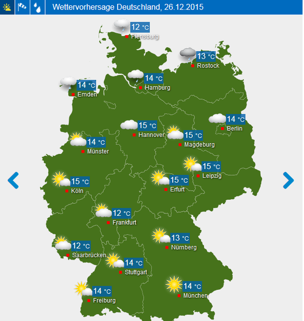 Diese Druckkonstellation begünstigt nach wie vor die Zufuhr extrem milder Luft, die vom östlichen Atlantik über Spanien und Frankreich zu uns geführt wird. Speziell im Norden des Landes könnte es an einem 26.12. seit Beginn der Wetteraufzeichnung noch nie so warm gewesen sein. Selbst in den Nächten beschränkt sich der Frost nur auf die Aufklarungsgebiete Süddeutschlands.